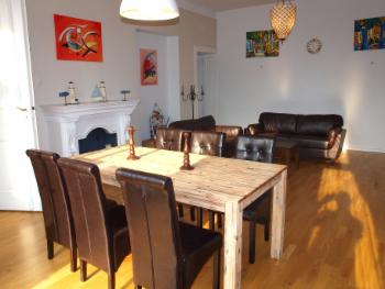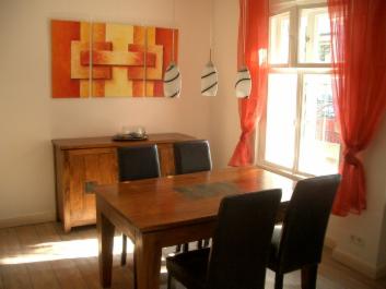 Wohnzimmer : Kabel-TV, CD-Radio, DSL-Internetanschluss (Flatrate), gemütliches Sofa / Schlafcouch, Esstisch für mind. 4 Personen, moderne Einrichtung, weiß gespachtelte Wände, Wandleuchter, Originalkunstwerke junger Künstler