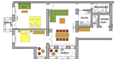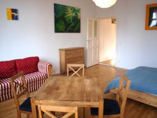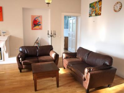 Das Wohnzimmer besitzt eine gemütliche Lümmelecke sowie einem hochwertigen Essbereich mit Lederstühlen und einer massiven Eichenholz-Esstafel. Die repräsentativen Räume haben eine Höhe von 3,2 m, sind mit Eichenparkett ausgelegt und betonen den Villencharakter dieses wunderschönen neoklassizistischen Gebäudes. Es existiert eine Kaminatrappe, ein TV-Gerät mit Kabelanschluss und ein DSL / W-Lan-Internetanschluss. Die Wohnung ist mit Originalkunstwerken junger Künstler ausgestattet, die Sie auf Wunsch auch käuflich erworben können. Sie ist eine Nichtraucherwohnung !!